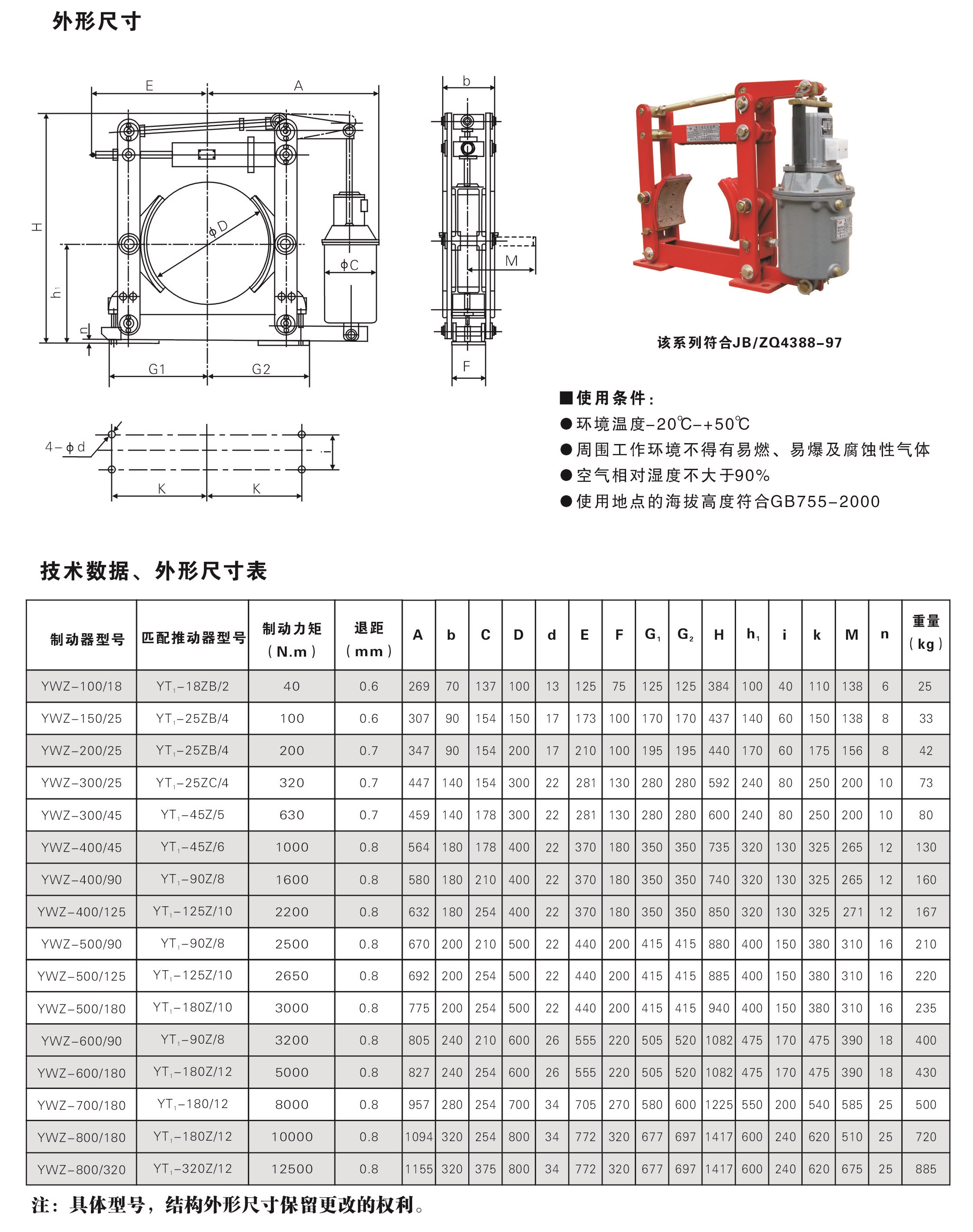 YWZ系列電力液壓塊式制動器主要用于起重、運輸、冶金、礦山、港口、建筑機械驅動裝置的機械制動,具有制動平穩(wěn),安全可靠、維修方便、耗電少、壽命長、無噪音等優(yōu)點。