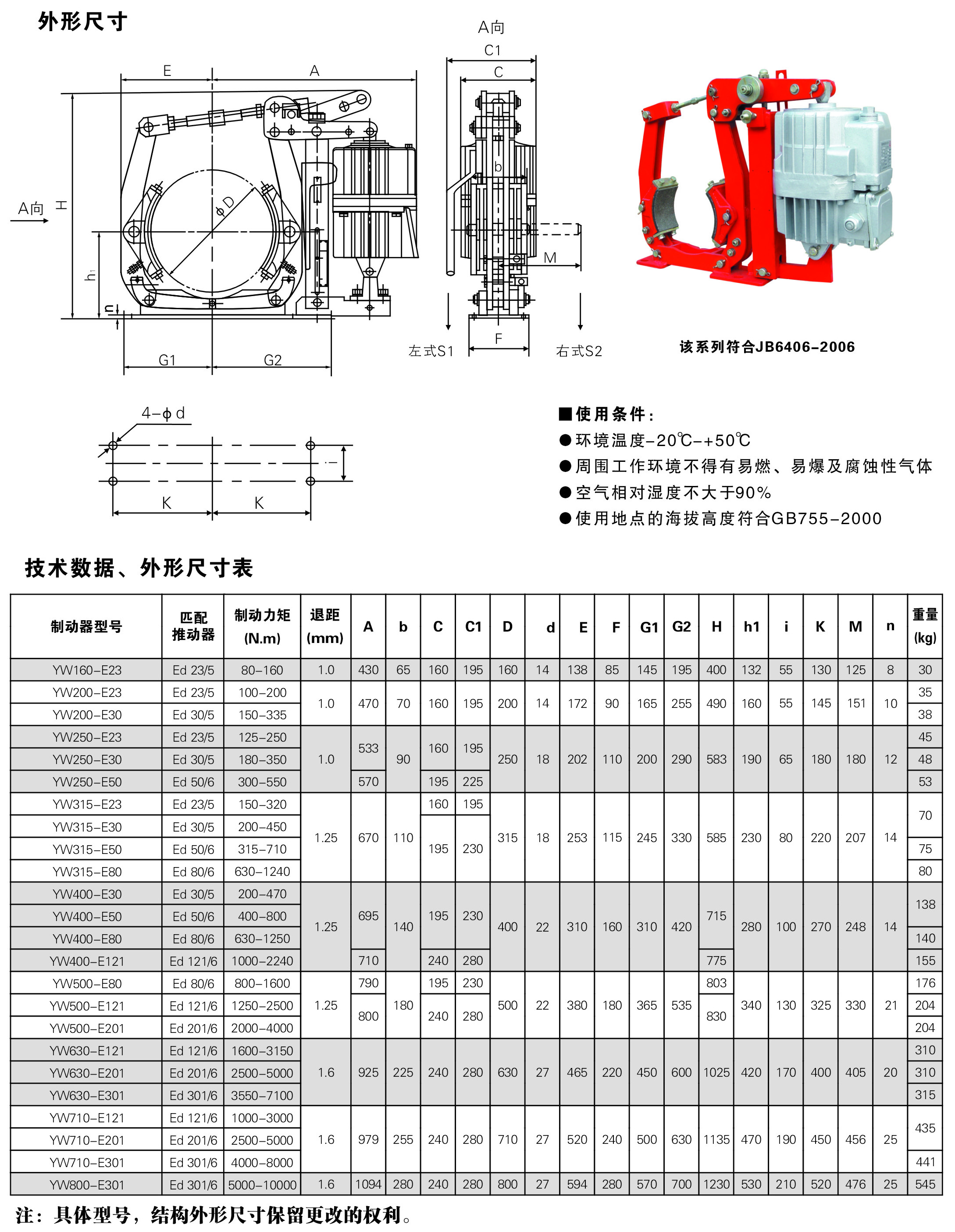 YW系列電力液壓塊式制動器主要用于起重、運輸、冶金、礦山、港口、建筑機(jī)械驅(qū)動裝置的機(jī)械制動,具有制動平穩(wěn),安全可靠、維修方便、耗電少、壽命長、無噪音等優(yōu)點。