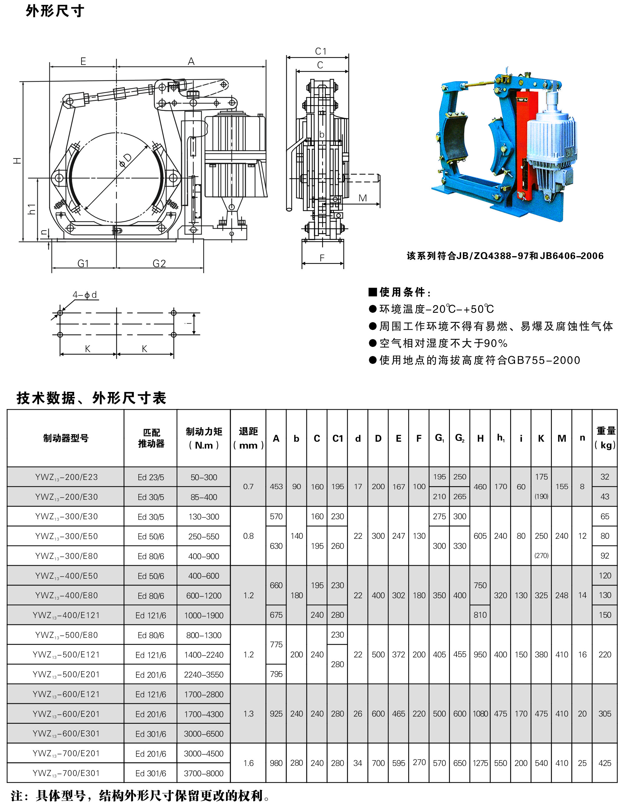 制動(dòng)器安裝尺寸和制動(dòng)力矩參數(shù):JB/ZQ4388-97標(biāo)準(zhǔn),技術(shù)要求符合JB/T6406-2006標(biāo)準(zhǔn)。